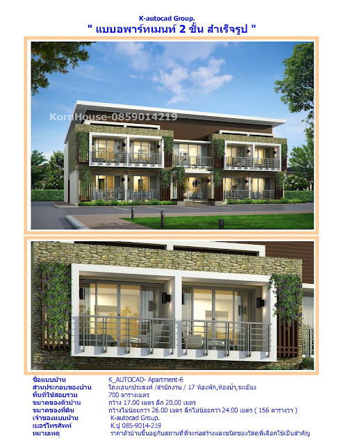แบบอพาร์ทเม้นท์ 2 ชั้น สวยๆสไตล์โมเดิร์น ทั้งหมด 17 ห้องพัก พื้นที่ใช้สอยรวม 700 ตารางเมตร รหัส APARTMENT-6